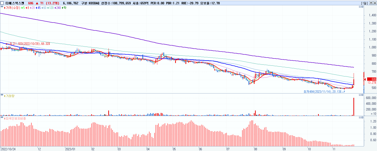 - 티에스넥스젠 (606원 ▲ 13.27% , 시총: 659억, 거래량: 6,118,684, 거래대금:38억)