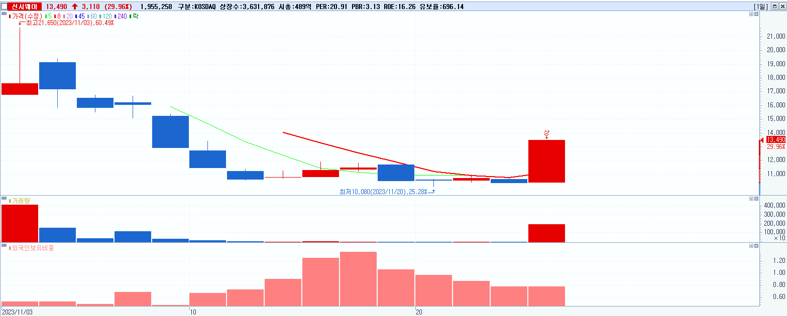 - 신시웨이 (13,490원 ▲ 29.96% , 시총: 490억, 거래량: 1,956,146, 거래대금:244억)