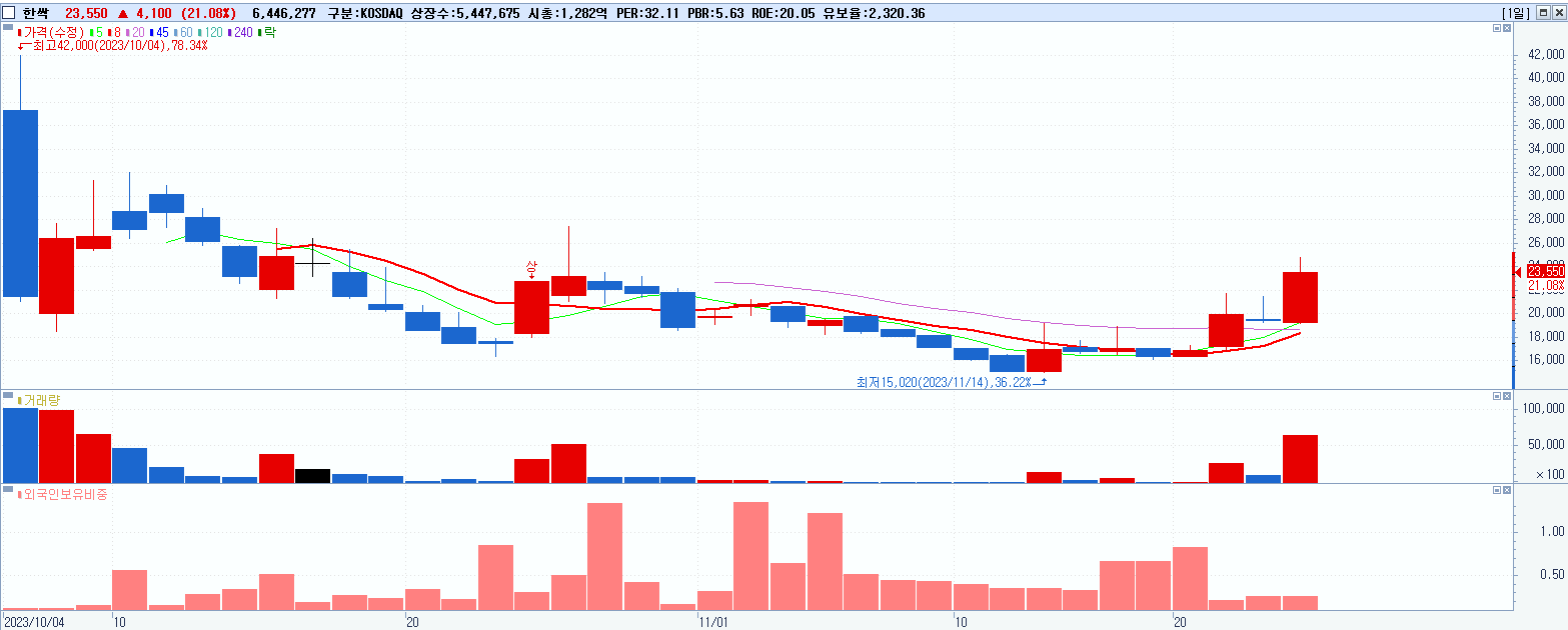 - 한싹 (23,550원 ▲ 21.08% , 시총: 1,283억, 거래량: 6,516,773, 거래대금:1,508억)