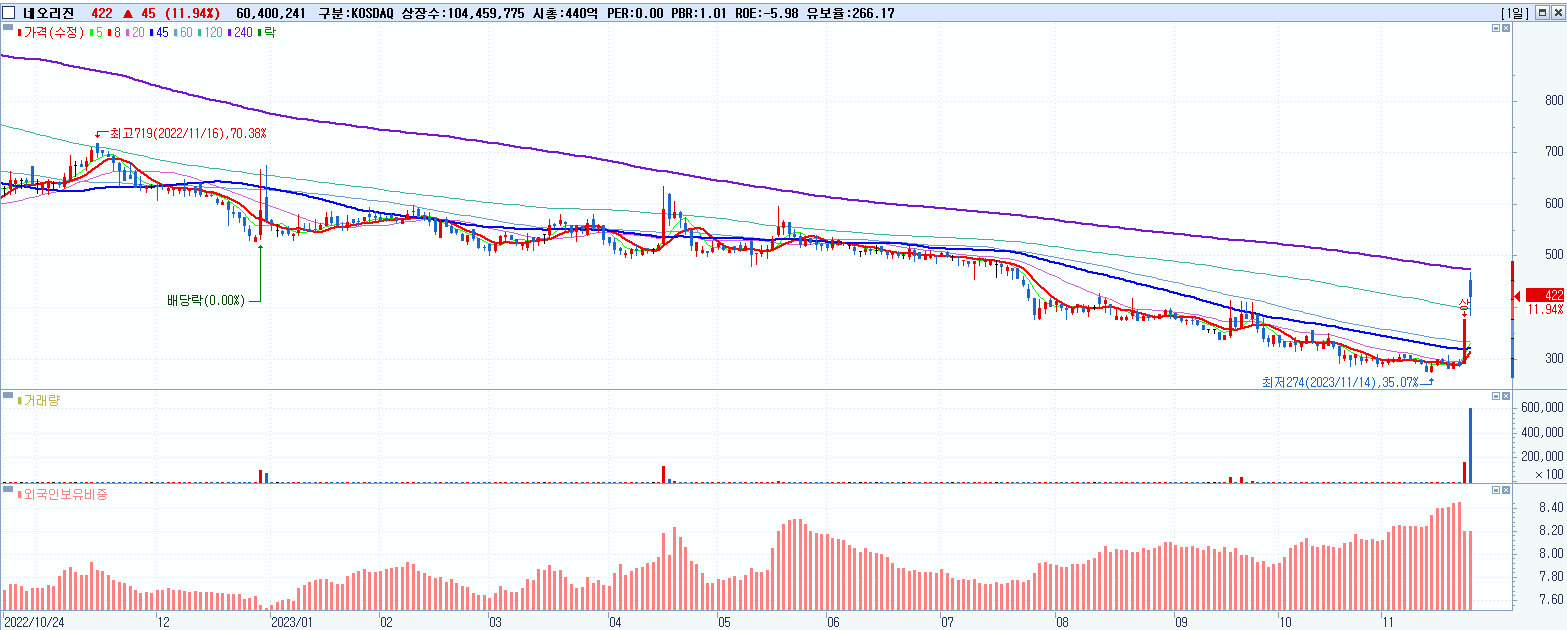 - 네오리진 (422원 ▲ 11.94% , 시총: 441억, 거래량: 60,501,411, 거래대금:262억)