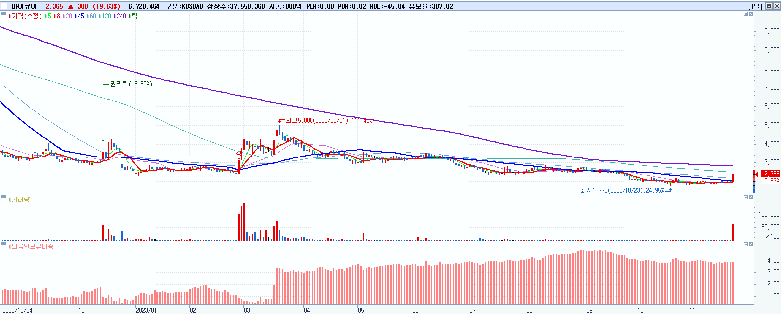 - 아이큐어 (2,365원 ▲ 19.63% , 시총: 888억, 거래량: 6,812,881, 거래대금:165억)