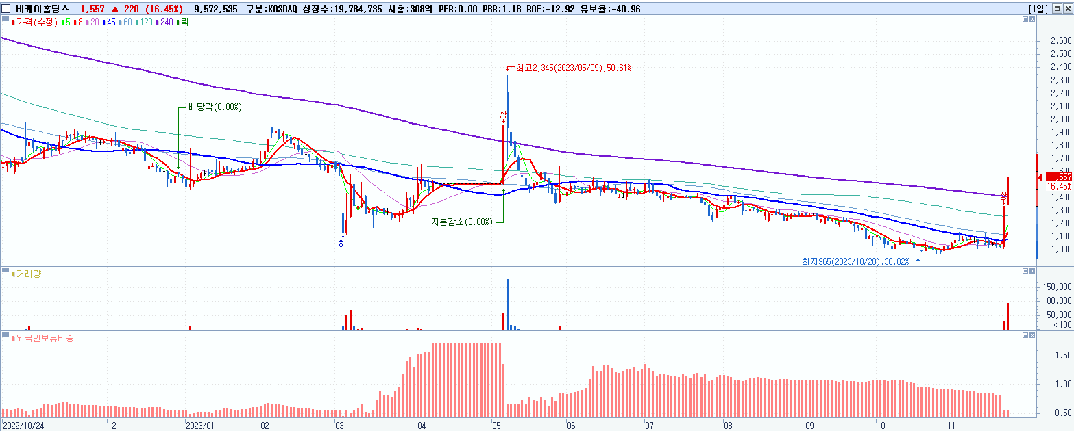 - 비케이홀딩스 (1,557원 ▲ 16.45% , 시총: 308억, 거래량: 9,602,394, 거래대금:151억)
