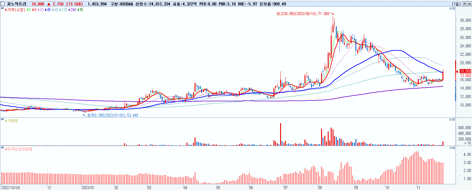 - 지노믹트리 (18,000원 ▲ 13.56% , 시총: 4,322억, 거래량: 1,463,604, 거래대금:257억)