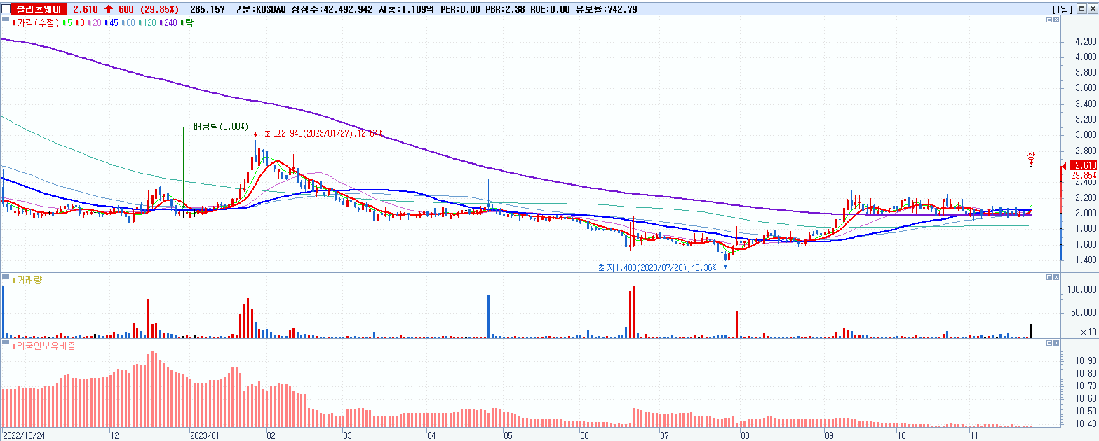 - 블리츠웨이 (2,610원 ▲ 29.85% , 시총: 1,109억, 거래량: 286,707, 거래대금:7억)