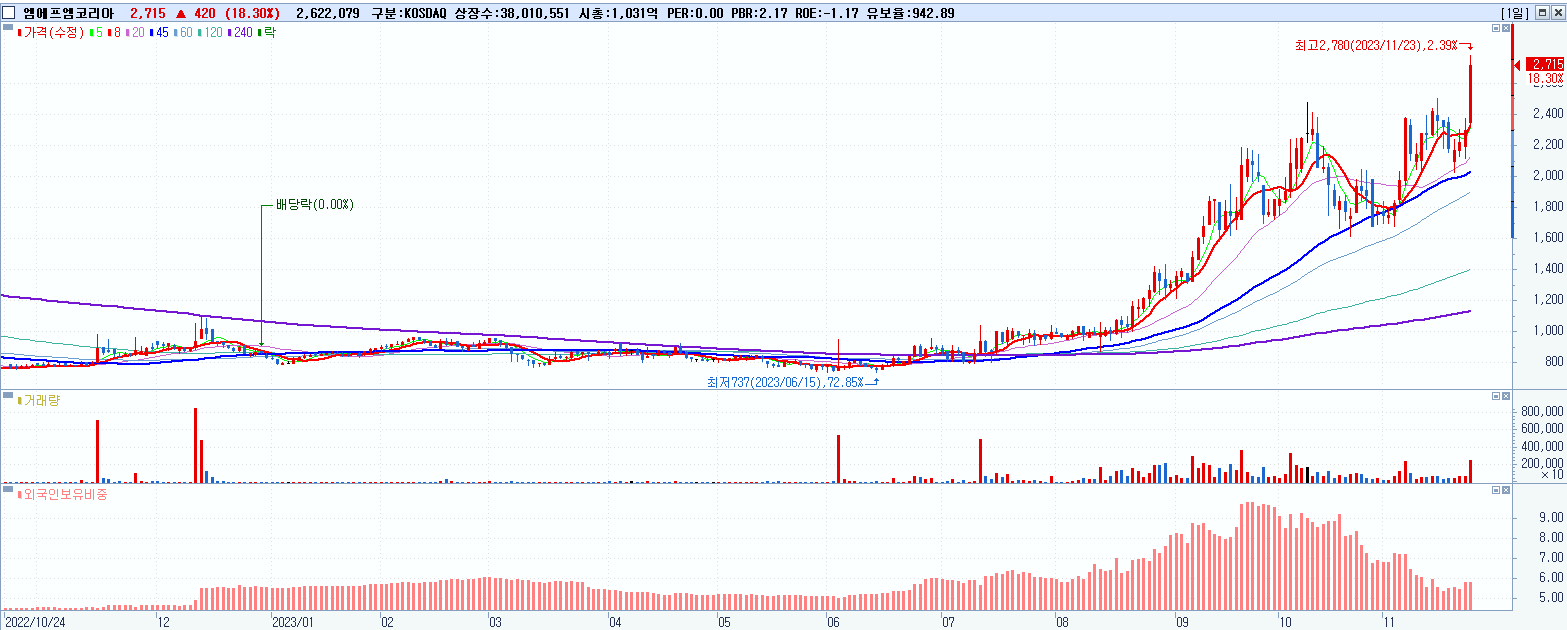 - 엠에프엠코리아 (2,715원 ▲ 18.3% , 시총: 1,032억, 거래량: 2,646,387, 거래대금:68억)