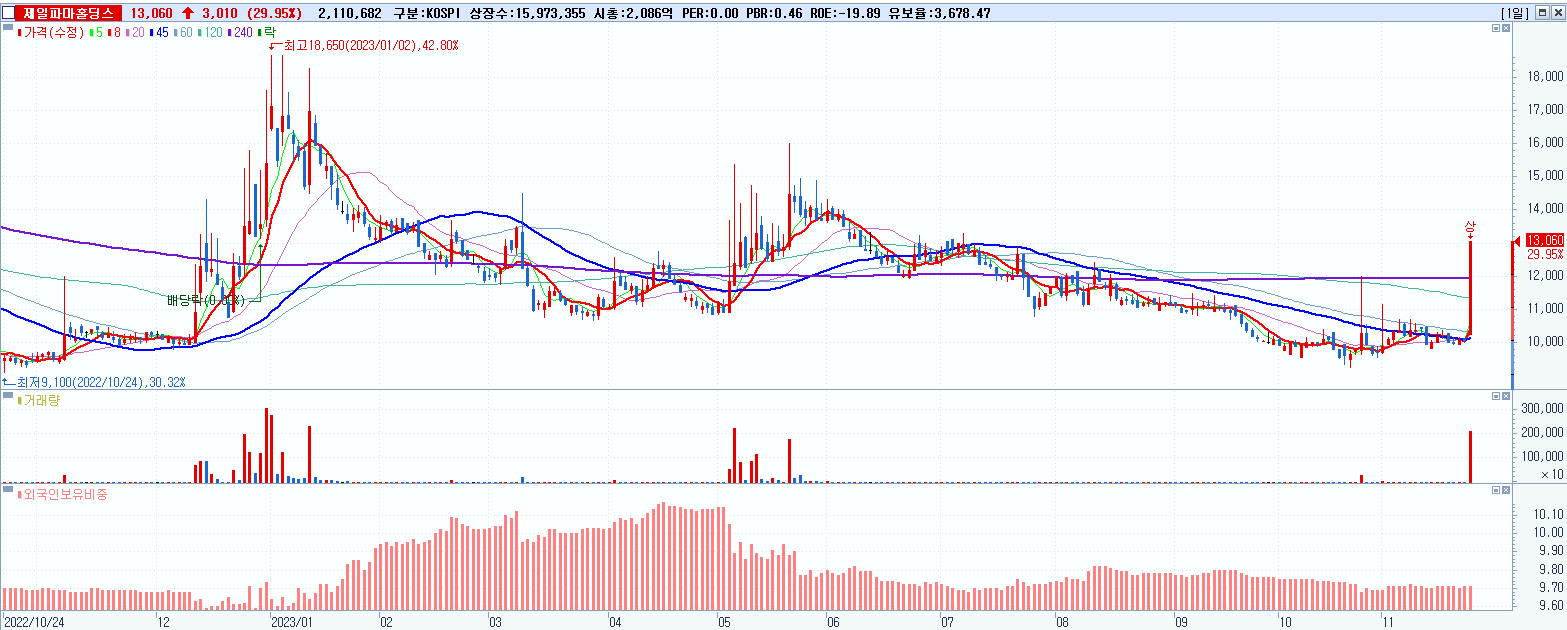 - 제일파마홀딩스 (13,060원 ▲ 29.95% , 시총: 2,086억, 거래량: 2,111,098, 거래대금:268억)