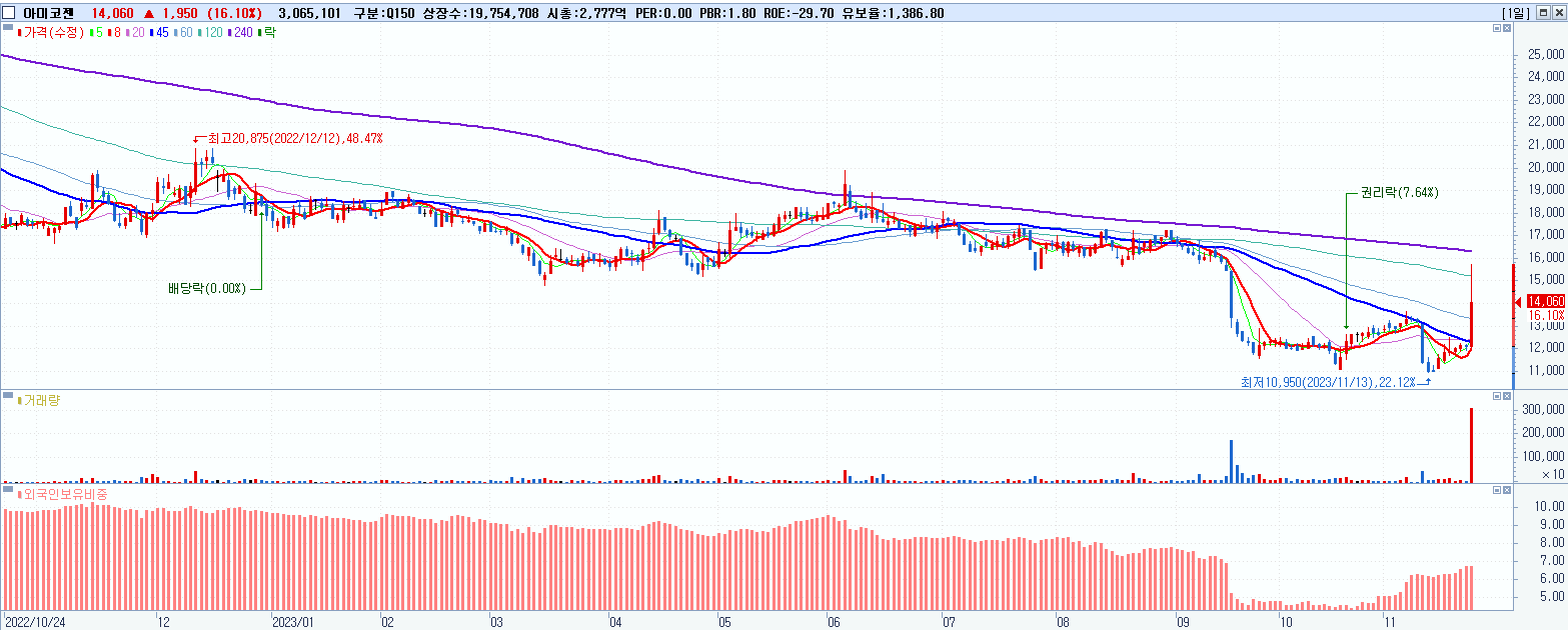 - 아미코젠 (14,060원 ▲ 16.1% , 시총: 2,778억, 거래량: 3,099,933, 거래대금:451억)