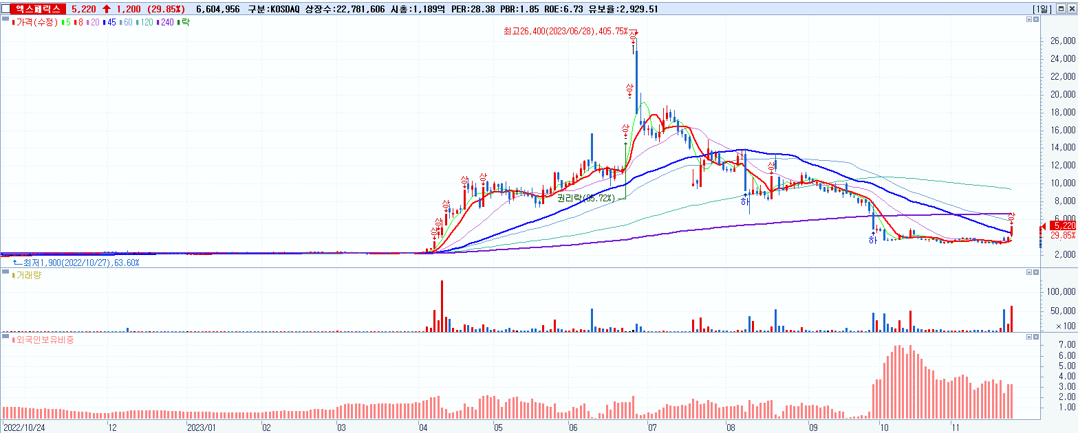 - 엑스페릭스 (5,220원 ▲ 29.85% , 시총: 1,189억, 거래량: 6,605,078, 거래대금:325억)