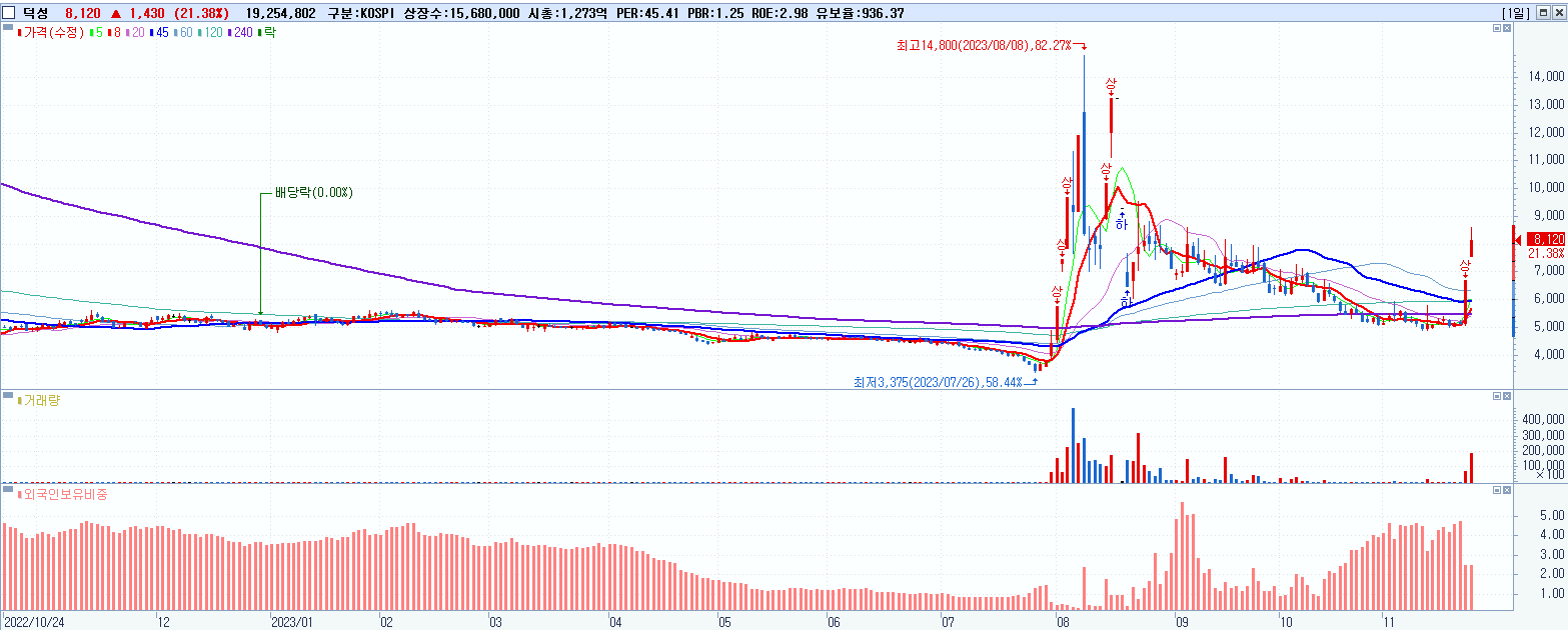 - 덕성 (8,120원 ▲ 21.38% , 시총: 1,273억, 거래량: 19,362,468, 거래대금:1,581억)