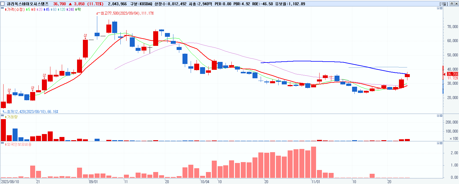 - 큐리옥스바이오시스템즈 (36,700원 ▲ 11.72% , 시총: 2,941억, 거래량: 2,050,531, 거래대금:727억)