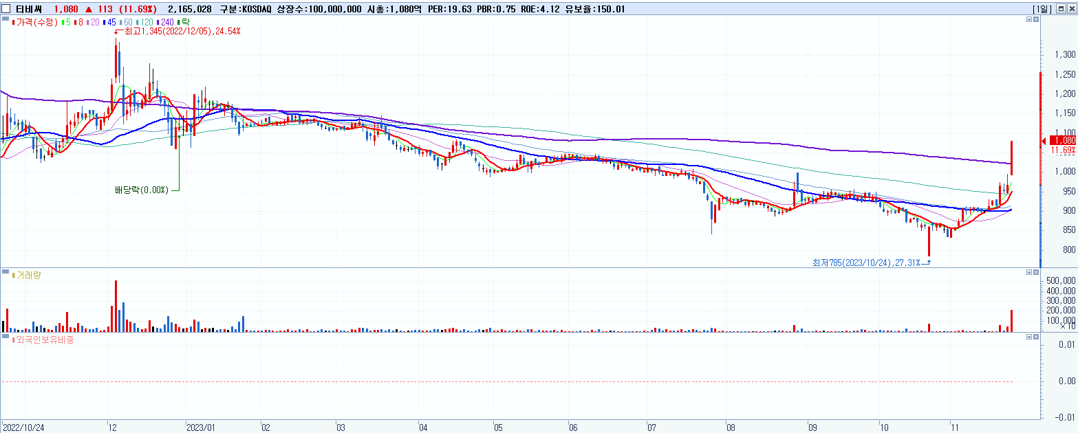 - 티비씨 (1,080원 ▲ 11.69% , 시총: 1,080억, 거래량: 2,216,416, 거래대금:23억)