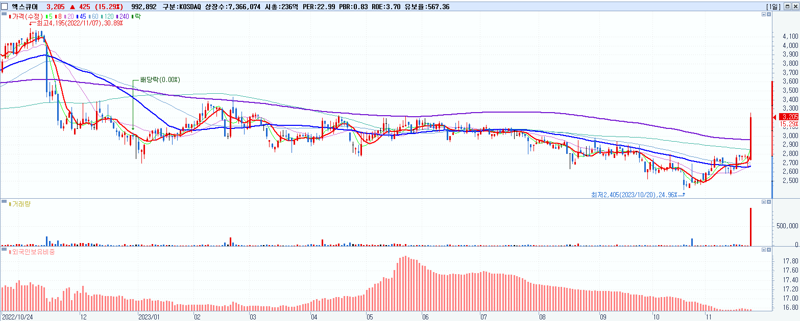 - 엑스큐어 (3,205원 ▲ 15.29% , 시총: 236억, 거래량: 994,577, 거래대금:31억)