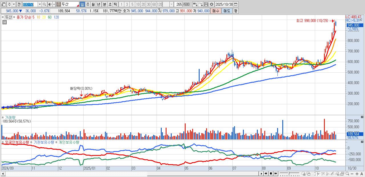 - 두산 (950,000원 ▼ -3.16% , 시총: 156,976억, 외국인 순매수 거래금:284억)
