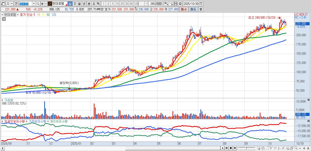 - 현대로템 (231,500원 ▲ 0.43% , 시총: 252,664억, 외국인 순매수 거래금:114억)