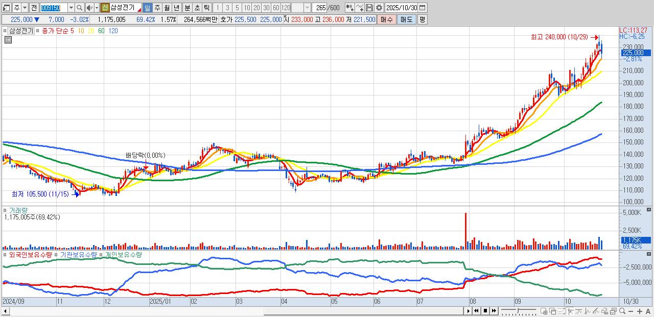 - 삼성전기 (225,000원 ▼ -3.02% , 시총: 168,061억, 외국인 순매수 거래금:216억)