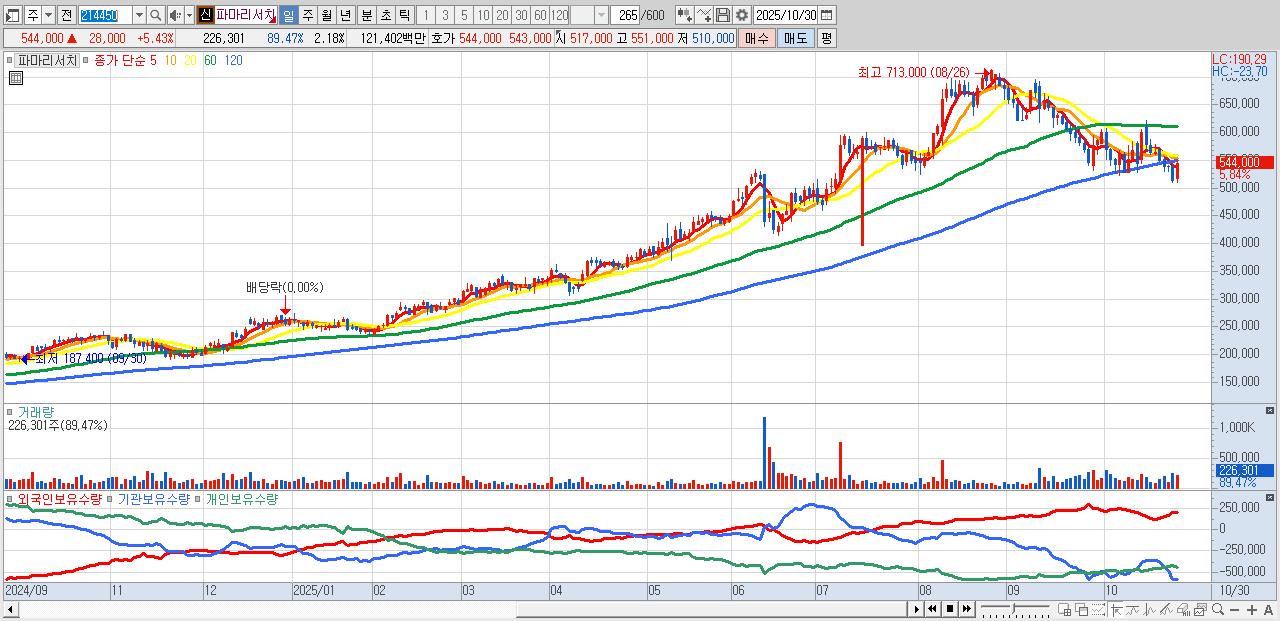 - 파마리서치 (544,000원 ▲ 5.43% , 시총: 56,520억, 외국인 순매수 거래금:139억)