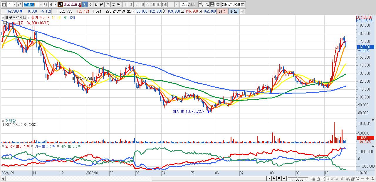 - 에코프로비엠 (162,600원 ▼ -5.3% , 시총: 159,025억, 외국인 순매수 거래금:146억)