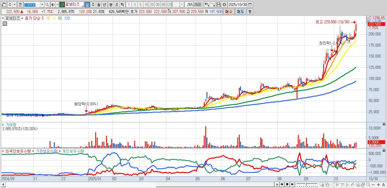 - 로보티즈 (222,500원 ▲ 7.75% , 시총: 29,416억, 외국인 순매수 거래금:246억)