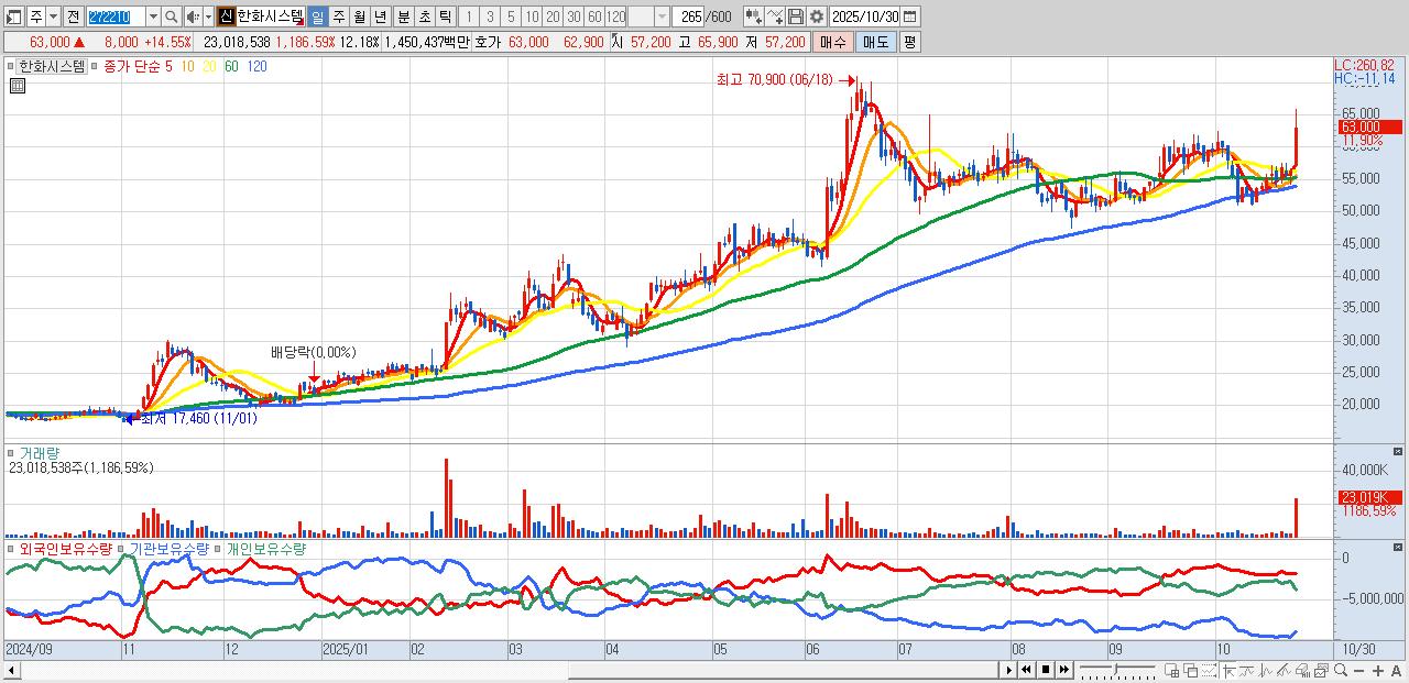 - 한화시스템 (63,000원 ▲ 14.55% , 시총: 119,019억, 외국인 순매수 거래금:445억)
