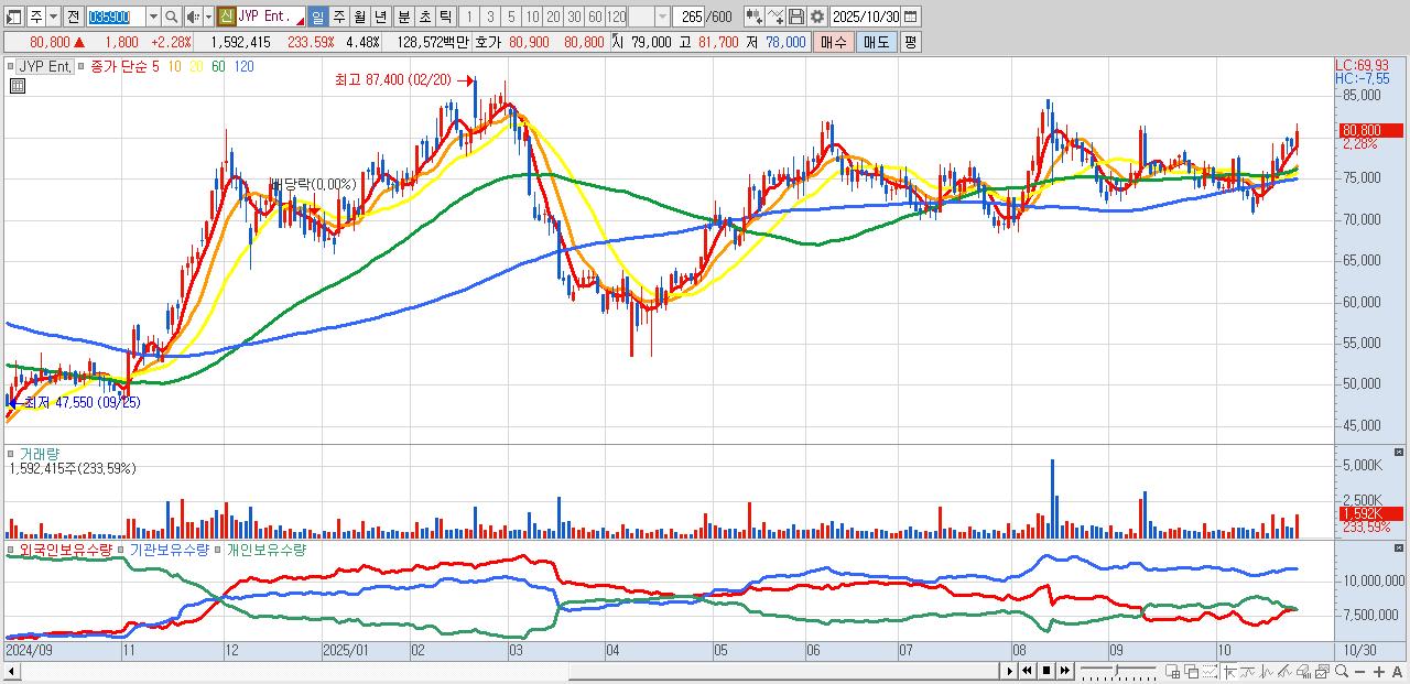- JYP Ent. (81,200원 ▲ 2.78% , 시총: 28,852억, 외국인 순매수 거래금:110억)