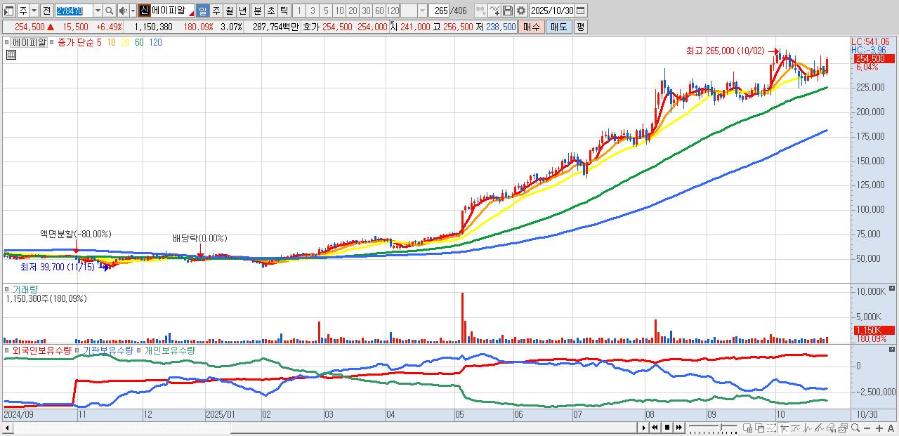 - 에이피알 (253,500원 ▲ 6.07% , 시총: 94,887억, 외국인 순매수 거래금:185억)