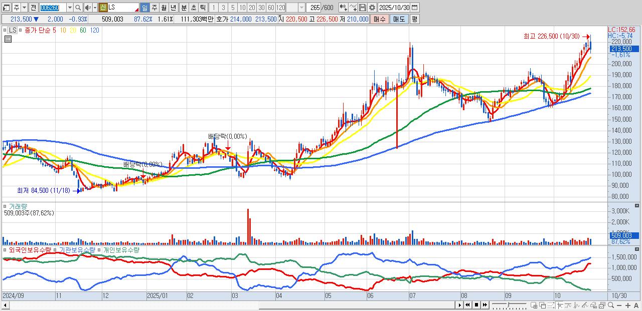 - LS (217,500원 ▲ 0.93% , 시총: 68,948억, 외국인 순매수 거래금:208억)