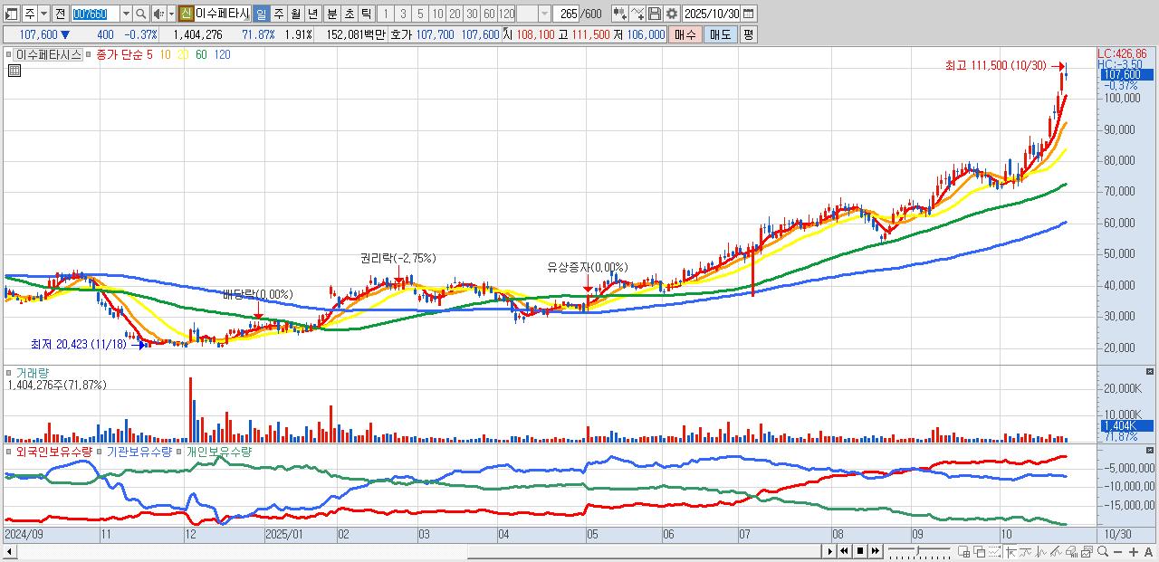 - 이수페타시스 (107,600원 ▼ -0.37% , 시총: 78,988억, 외국인 순매수 거래금:148억)
