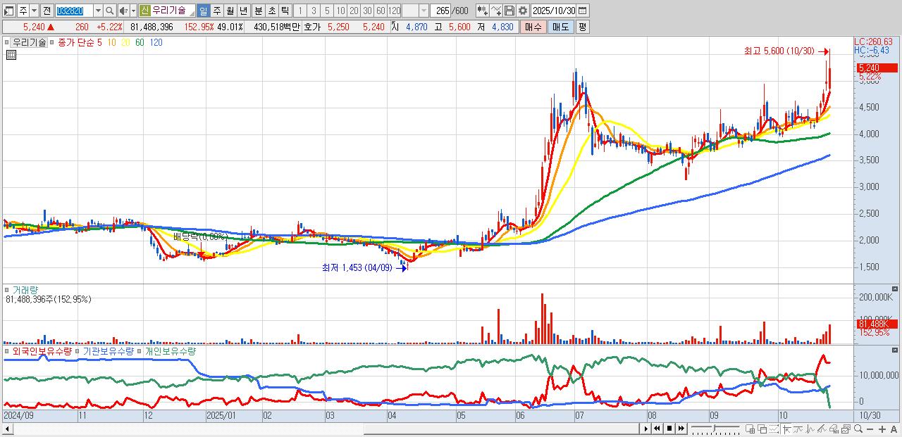 - 우리기술 (5,240원 ▲ 5.22% , 시총: 8,713억, 외국인 순매수 거래금:421억)
