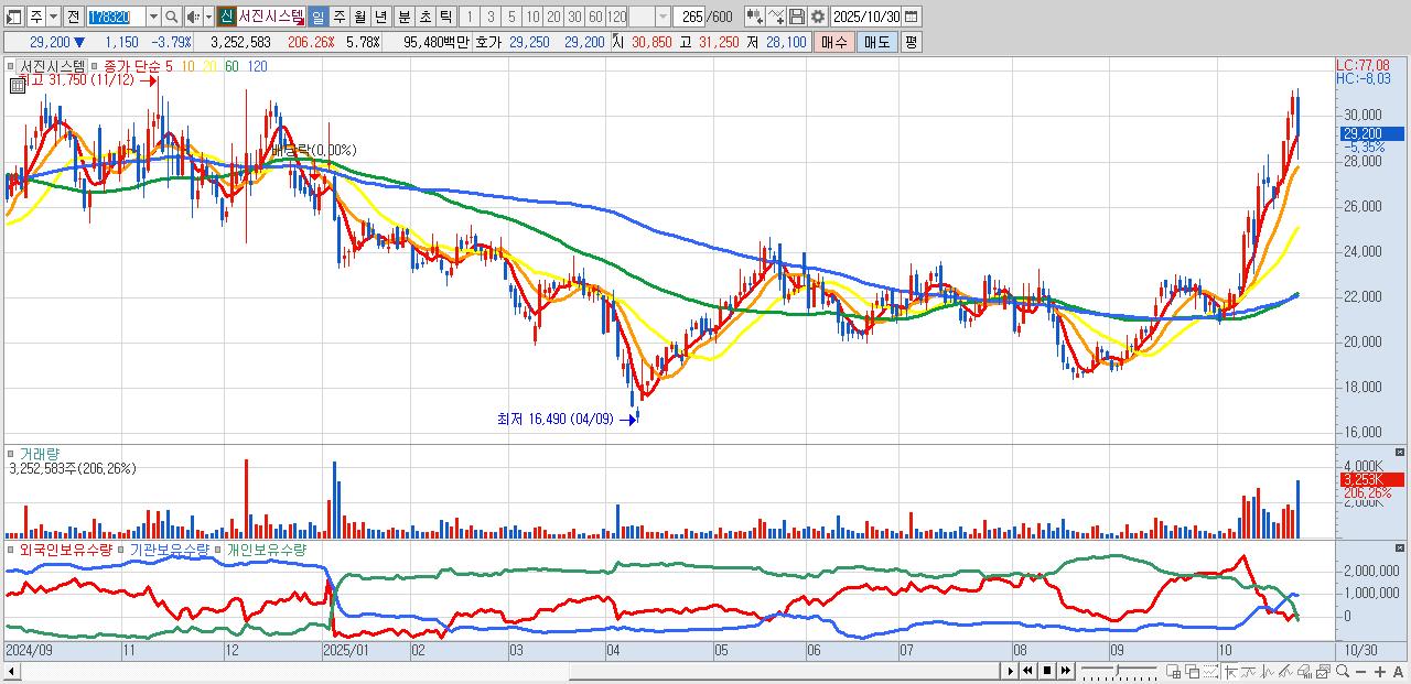 - 서진시스템 (28,850원 ▼ -4.94% , 시총: 16,228억, 외국인 순매수 거래금:295억)