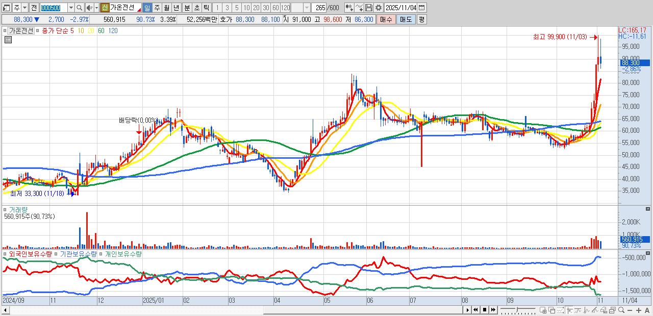- 가온전선 (93,200원 ▲ 2.42% , 시총: 15,418억, 거래량: 255,203, 거래대금:237억, KOSPI)