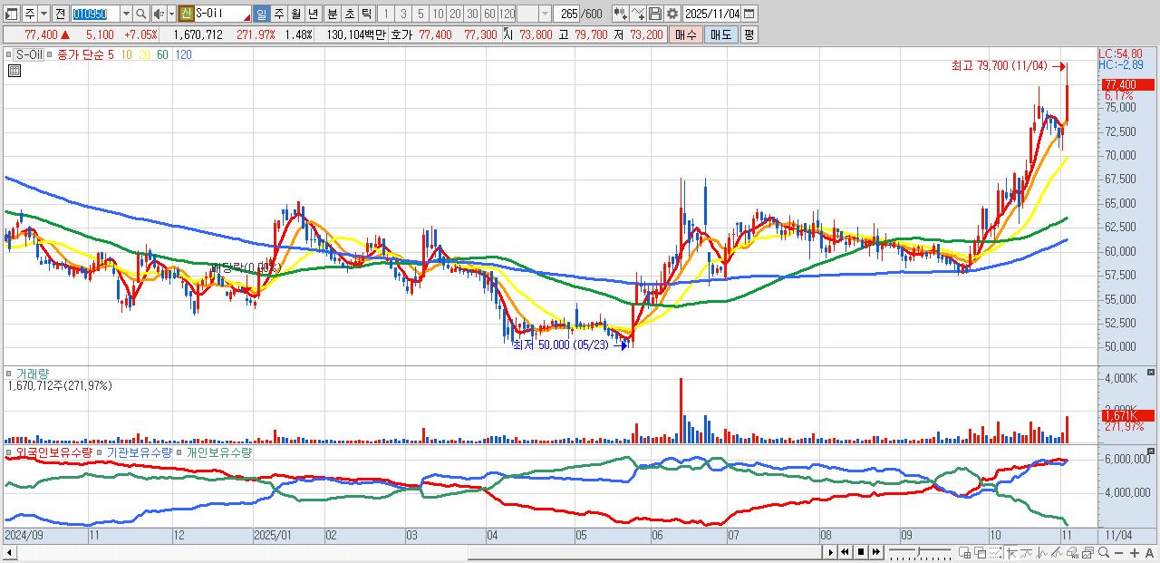 - S-Oil (77,300원 ▲ 6.92% , 시총: 87,026억, 거래량: 1,074,010, 거래대금:838억, KOSPI)