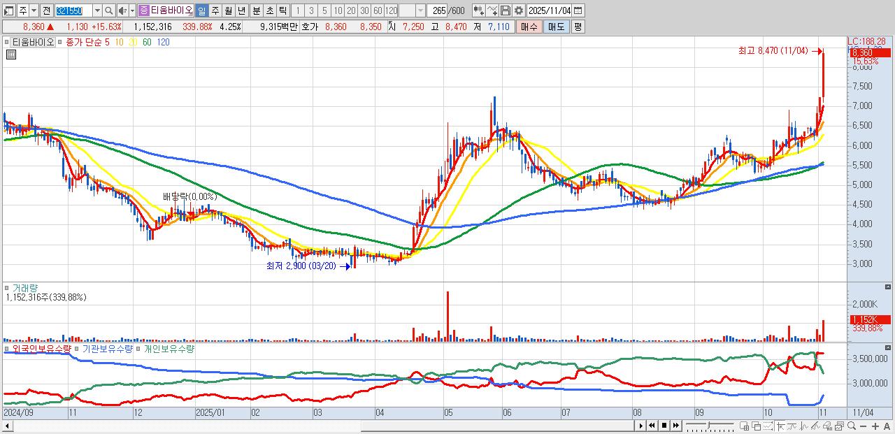 - 티움바이오 (8,360원 ▲ 15.63% , 시총: 2,269억, 거래량: 1,152,316, 거래대금:93억, KOSDAQ)