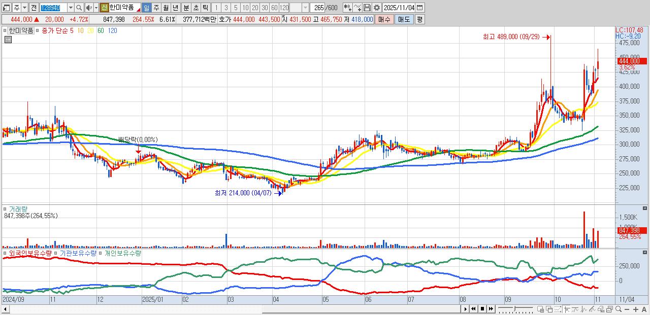 - 한미약품 (451,500원 ▲ 6.49% , 시총: 57,842억, 거래량: 458,937, 거래대금:2,048억, KOSPI)