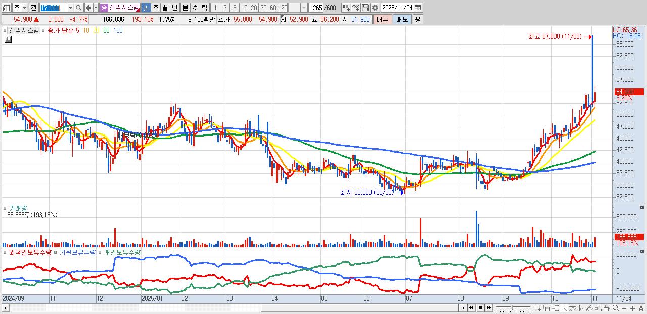 - 선익시스템 (55,800원 ▲ 6.49% , 시총: 5,334억, 거래량: 81,706, 거래대금:45억, KOSDAQ)