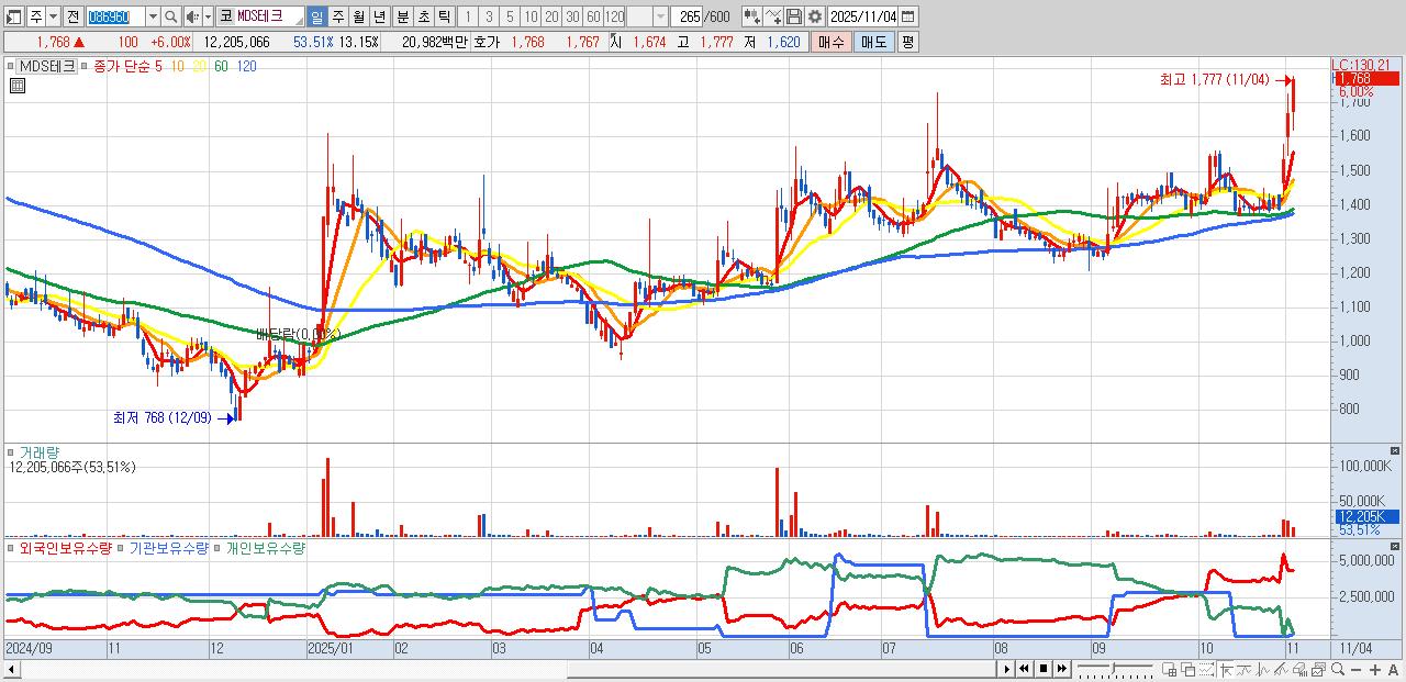 - MDS테크 (1,768원 ▲ 6% , 시총: 1,641억, 거래량: 12,205,066, 거래대금:210억, KOSDAQ)