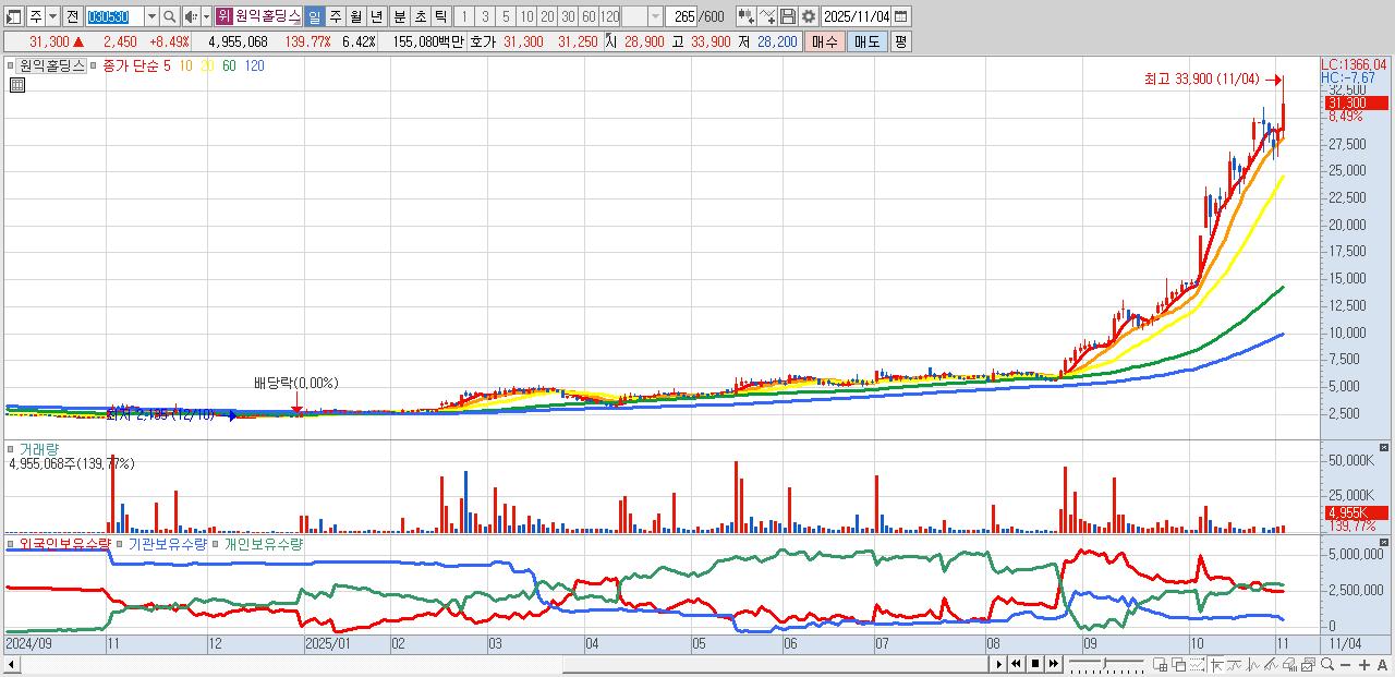 - 원익홀딩스 (31,300원 ▲ 8.49% , 시총: 24,175억, 거래량: 4,955,068, 거래대금:1,551억, KOSDAQ)