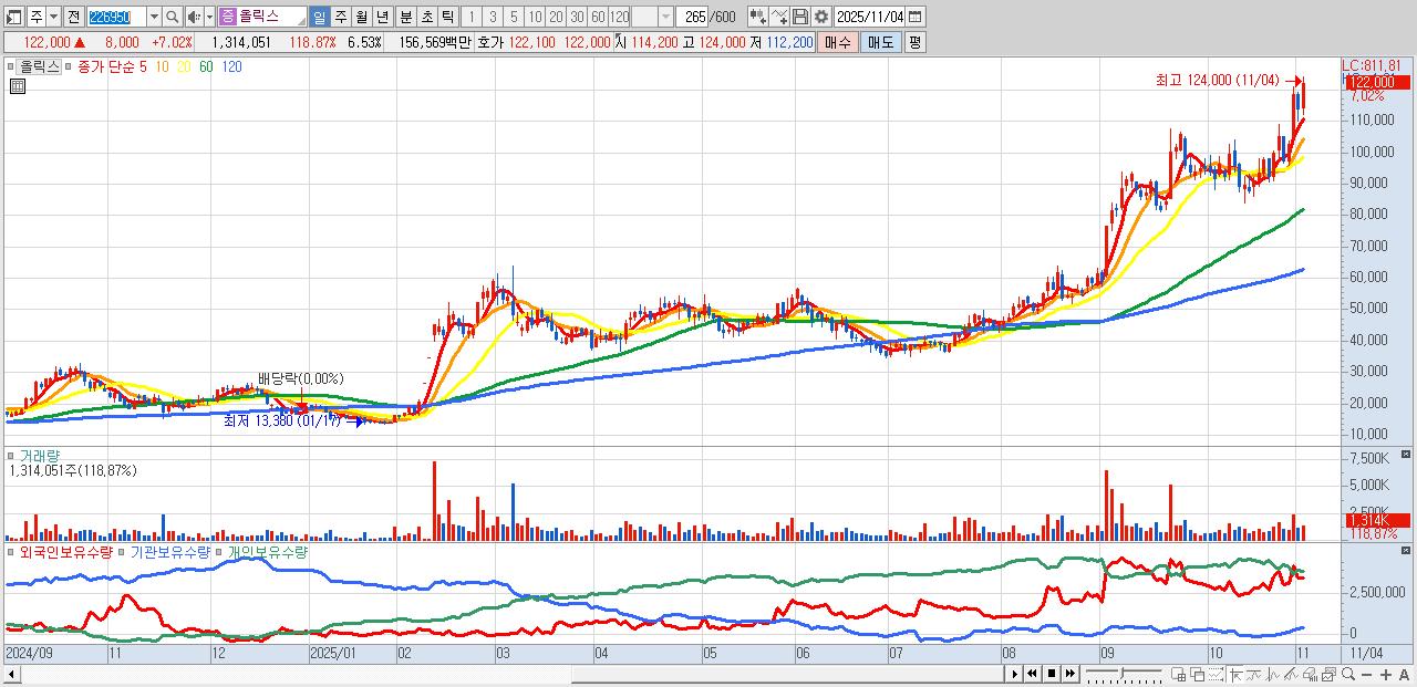 - 올릭스 (122,000원 ▲ 7.02% , 시총: 24,540억, 거래량: 1,314,051, 거래대금:1,566억, KOSDAQ)