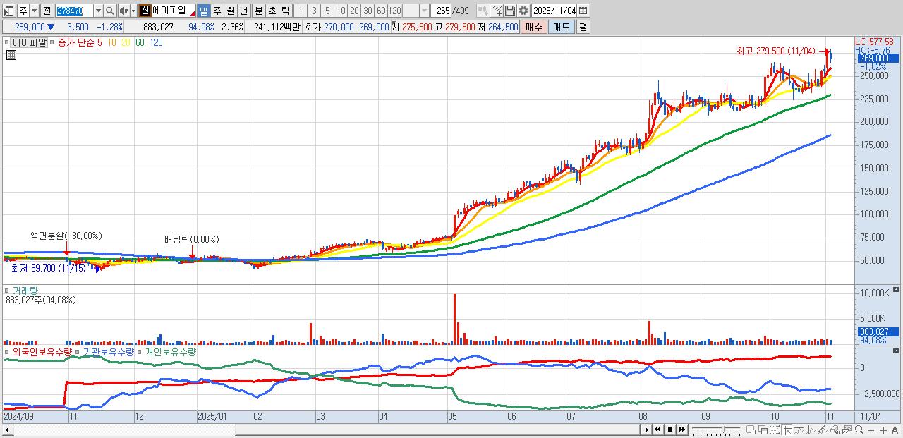 - 에이피알 (276,000원 ▲ 1.28% , 시총: 103,309억, 거래량: 500,326, 거래대금:1,367억, KOSPI)