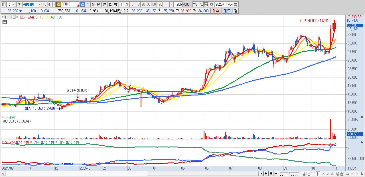 - RFHIC (36,750원 ▲ 1.24% , 시총: 9,740억, 거래량: 371,483, 거래대금:135억, KOSDAQ)