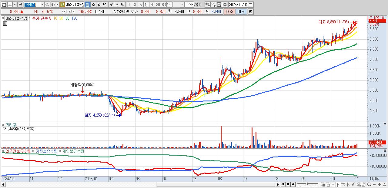 - 미래에셋생명 (8,890원 ▲ 0.57% , 시총: 15,737억, 거래량: 281,443, 거래대금:25억, KOSPI)