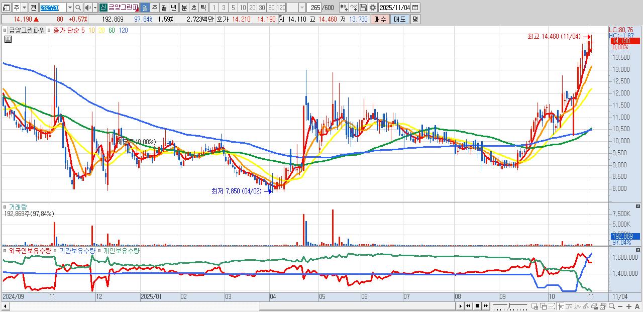- 금양그린파워 (14,400원 ▲ 2.06% , 시총: 1,745억, 거래량: 128,690, 거래대금:18억, KOSDAQ)