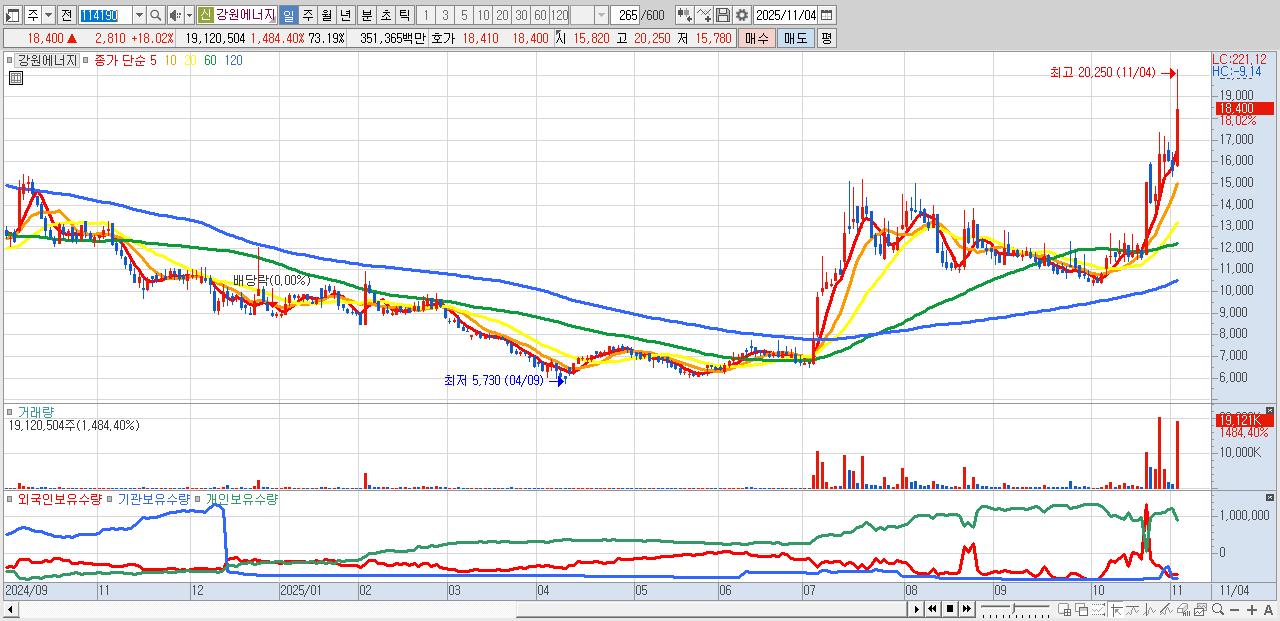 - 강원에너지 (18,400원 ▲ 18.02% , 시총: 4,807억, 거래량: 19,120,504, 거래대금:3,514억, KOSDAQ)