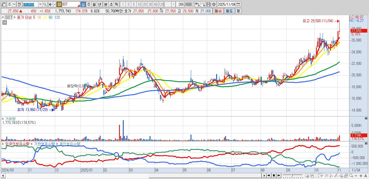 - GST (28,500원 ▲ 4.78% , 시총: 5,253억, 거래량: 824,926, 거래대금:237억, KOSDAQ)
