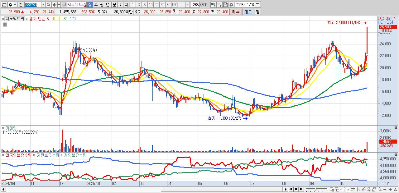 - 지노믹트리 (25,950원 ▲ 17.16% , 시총: 6,326억, 거래량: 608,206, 거래대금:152억, KOSDAQ)