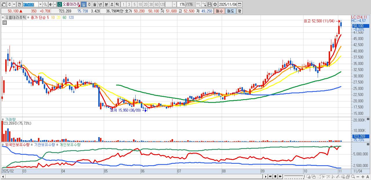 - 오름테라퓨틱 (52,000원 ▲ 4.52% , 시총: 11,002억, 거래량: 330,571, 거래대금:168억, KOSDAQ)