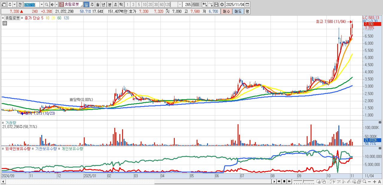 - 휴림로봇 (7,330원 ▲ 3.39% , 시총: 8,756억, 거래량: 21,072,298, 거래대금:1,514억, KOSDAQ)