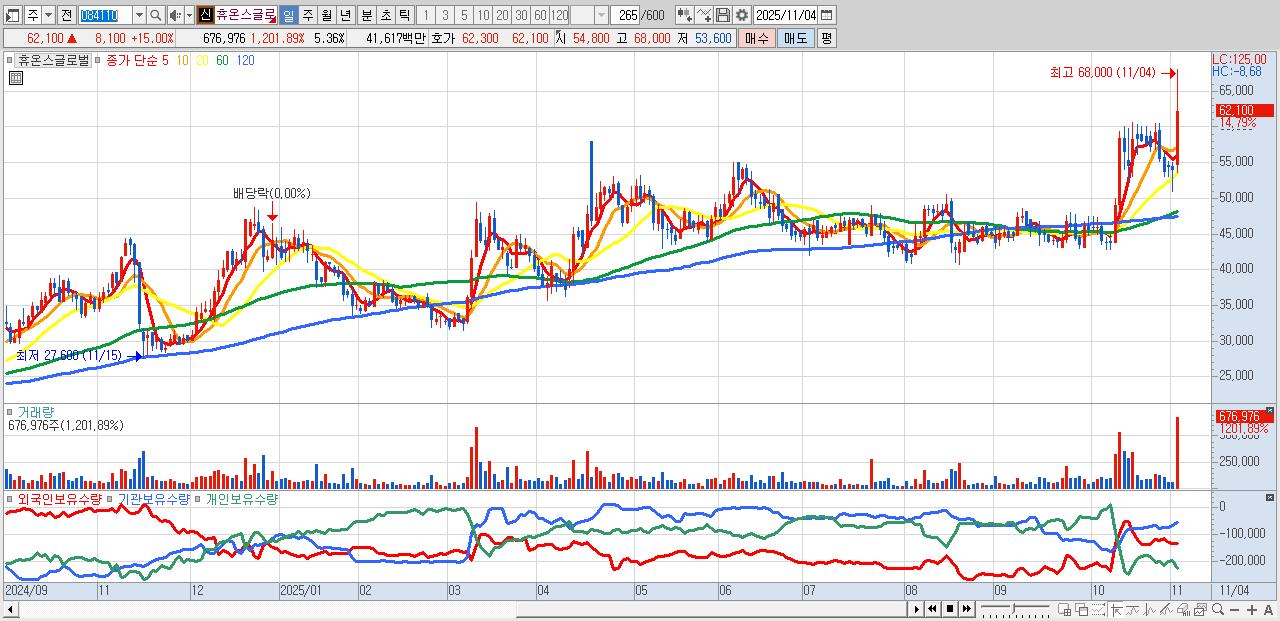 - 휴온스글로벌 (62,100원 ▲ 15% , 시총: 7,847억, 거래량: 383,888, 거래대금:235억, KOSDAQ)