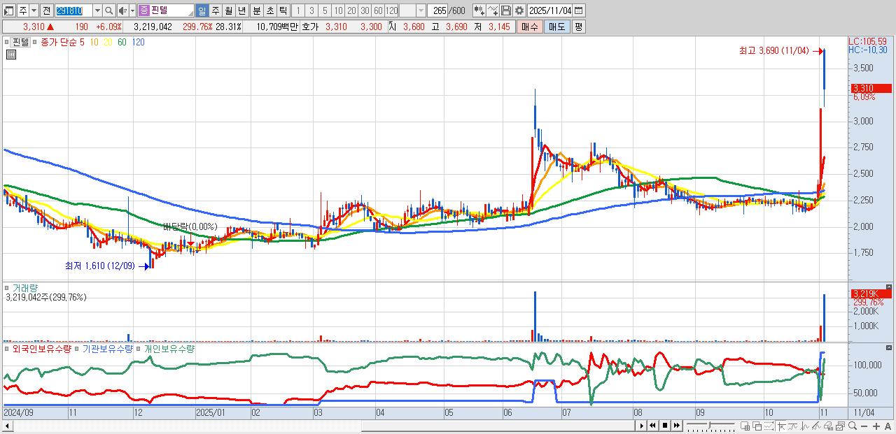 - 핀텔 (3,310원 ▲ 6.09% , 시총: 376억, 거래량: 3,219,042, 거래대금:107억, KOSDAQ)