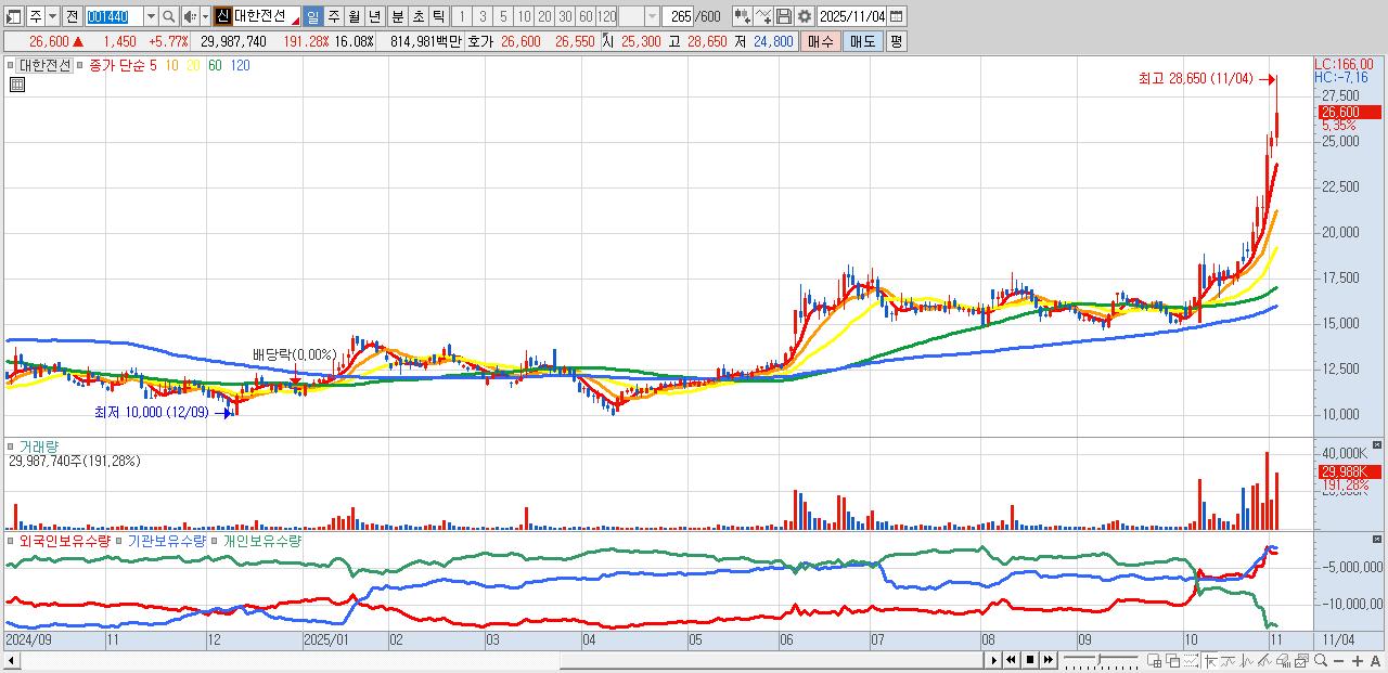 - 대한전선 (27,100원 ▲ 7.75% , 시총: 50,527억, 거래량: 11,606,396, 거래대금:3,175억, KOSPI)