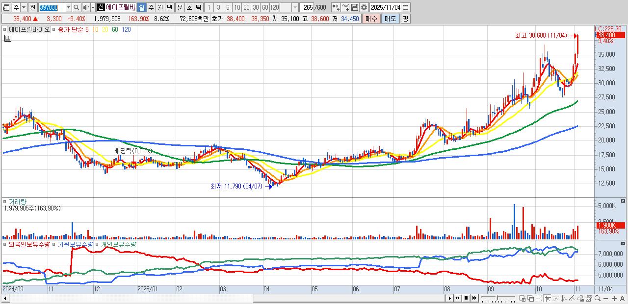 - 에이프릴바이오 (38,400원 ▲ 9.4% , 시총: 8,819억, 거래량: 1,979,905, 거래대금:728억, KOSDAQ)